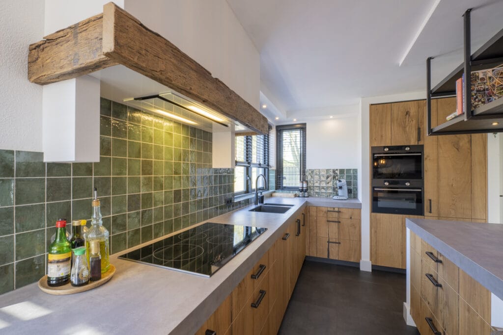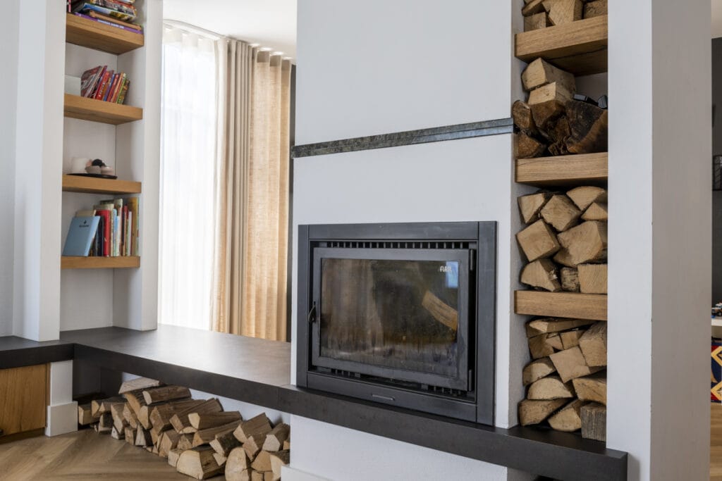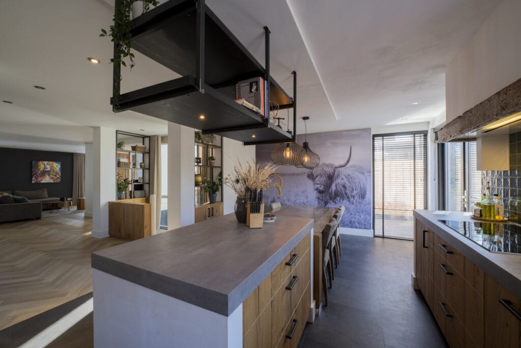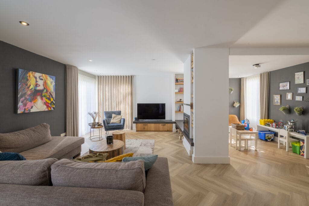 De combinatie van glad stucwerk en sfeervolle elementen, zoals houten accenten en zwart stalen details, geeft de woning een eigentijdse uitstraling. De open indeling en de doordachte materiaalkeuzes versterken het stijlvolle karakter van de benedenverdieping.